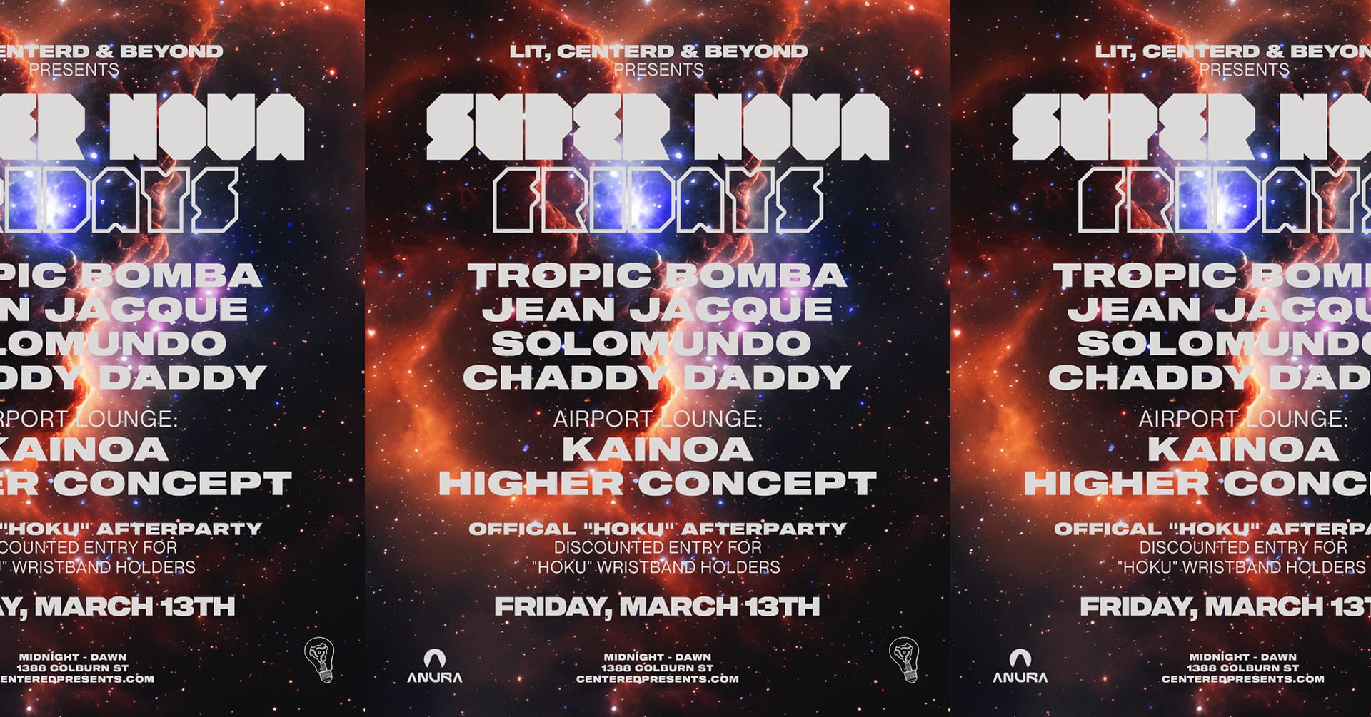 ANURA 1388 Colburn St., HonoluluFriday, March 13th Your favorite link-up is joining forces to keep the party going after HŌKŪ Fridays launches at OHANA HALE X KALA WAIKIKI this week. Grab a presale or hold on to those wristband and save! Lit, Centered & Beyond presents, SUPER NOVA FRIDAYS UPSTAIRS: TROPIC BOMBA JEAN JACQUE SOLOMUNDO CHADDY DADDY ... Read moreLCB – SUPER NOVA FRIDAYS @ ANURA