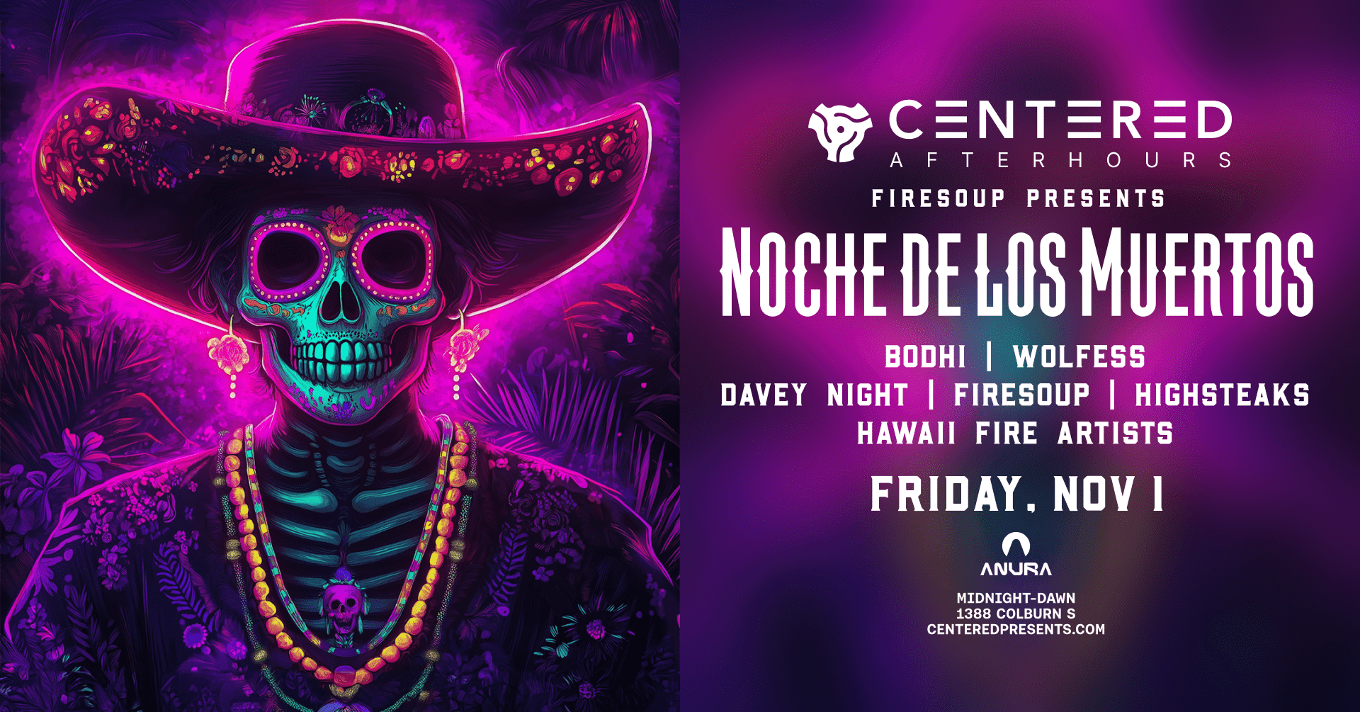 Friday, Nov 1st Centered Afterhours, NOCHE DE LOS MUERTOS BODHI WOLFESS DAVEY NIGHT FIRESOUPÂ HIGHSTEAKS + HAWAII FIRE ARTISTS Firesoup presents the night of the dead featuring an all-star lineup and guest DJ's all night at the newly upgraded Anura. ANURA MIDNIGHT-DAWN | 1388 Colburn St CenteredPresents.com