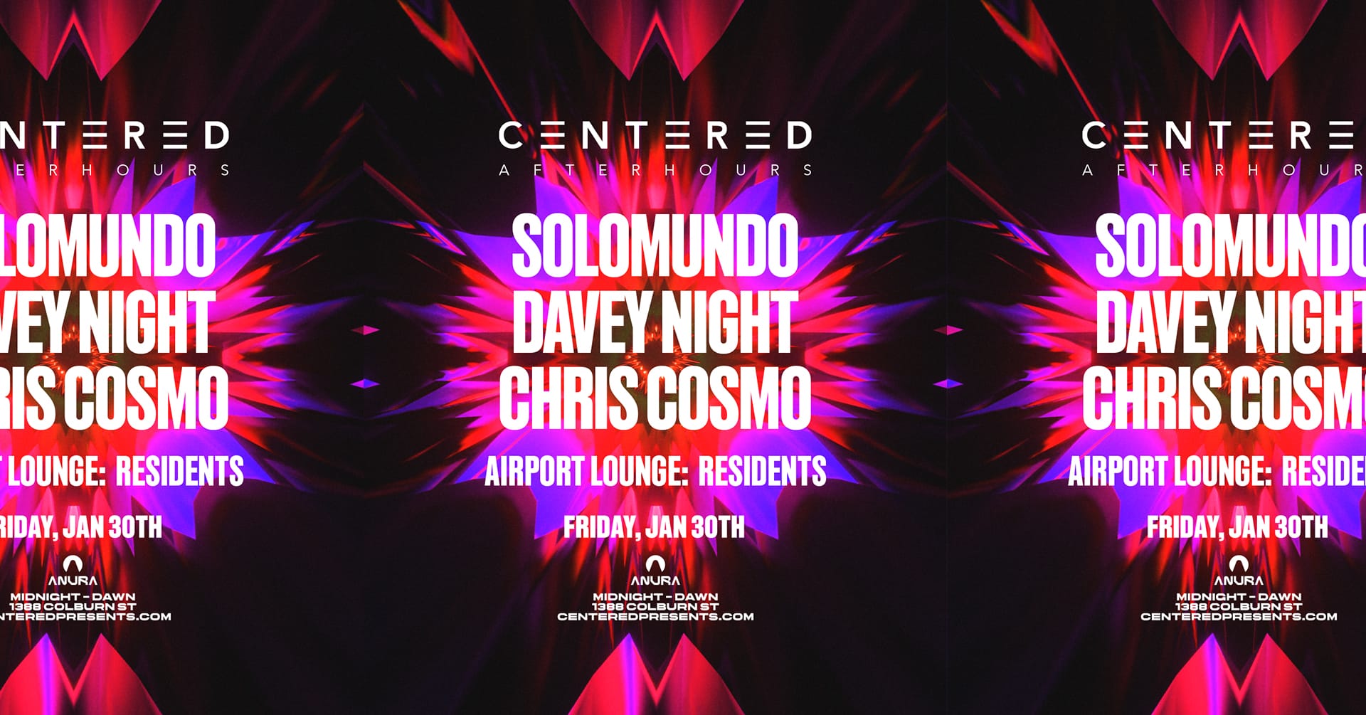 Friday, January 30th CENTERED AFTERHOURS SOLOMUNDO DAVEY NIGHT CHRIS COSMO AIRPORT LOUNGE: RESIDENTS ANURA MIDNIGHT-DAWN | 1388 COLBURN ST. CENTEREDPRESENTS.COM
