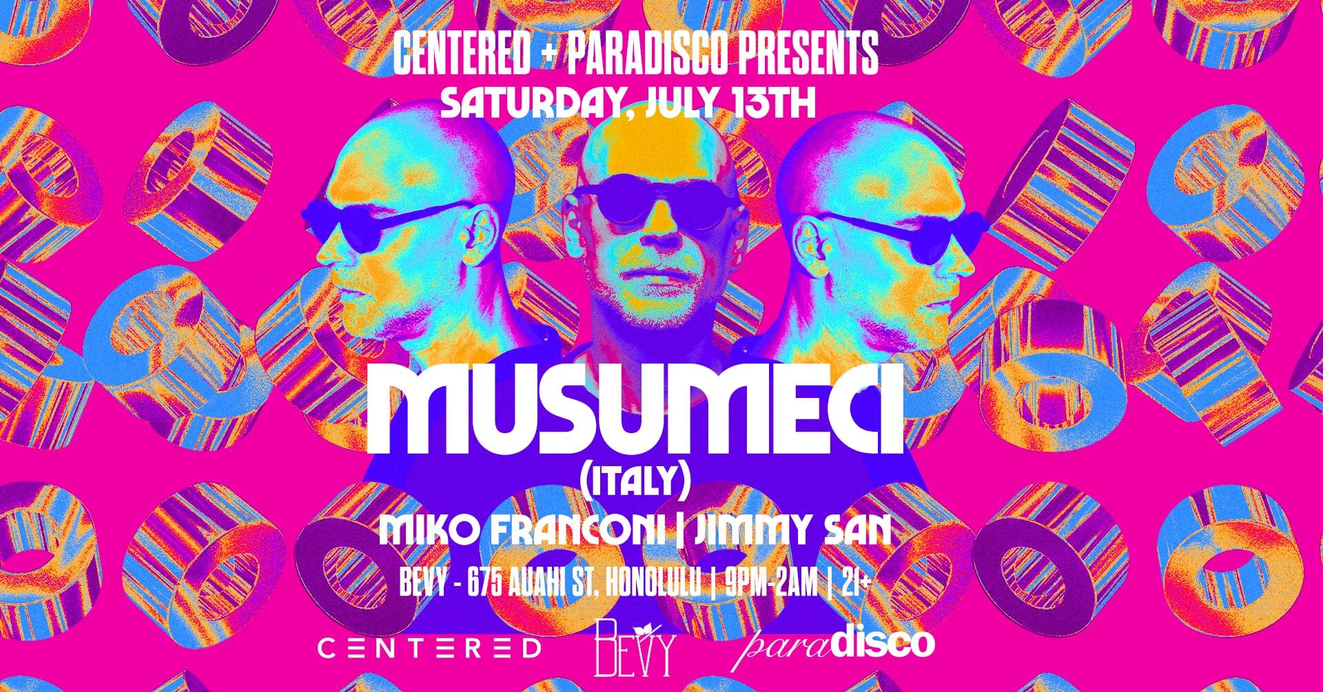 Saturday, July 13th MUSUMECI (ITALY) BIO: Musumeci is a musical project by Mauro Di Martino, Sicilian DJ and producer since late 80s. After two decades of releasing music under several aliases, Mauro merged into Musumeci’s alter ego in 2009. In 2014 ‘The Gemini Project’ album on Engrave Ltd has put Musumeci on the map ... Read moreCentered + Paradisco presents, MUSUMECI (Italy) @ BEVY