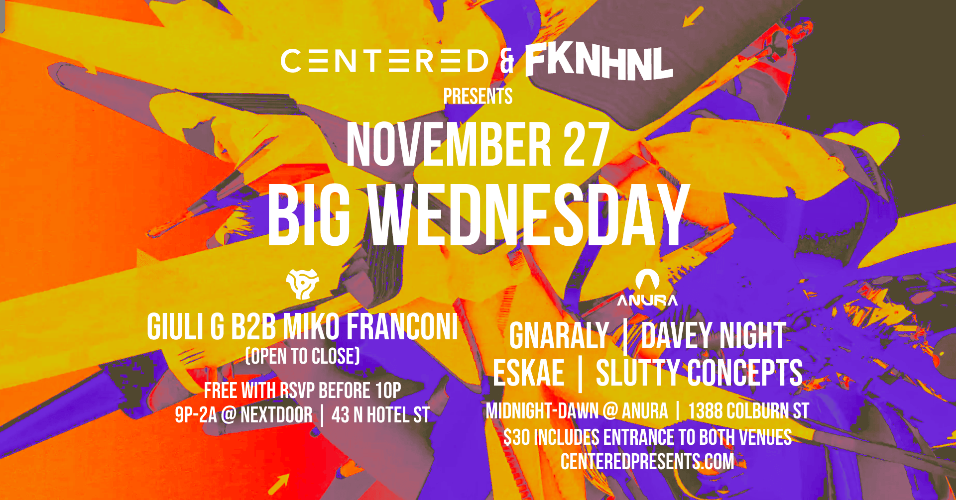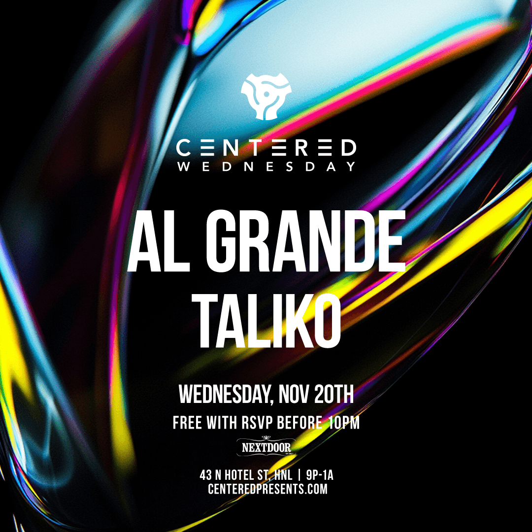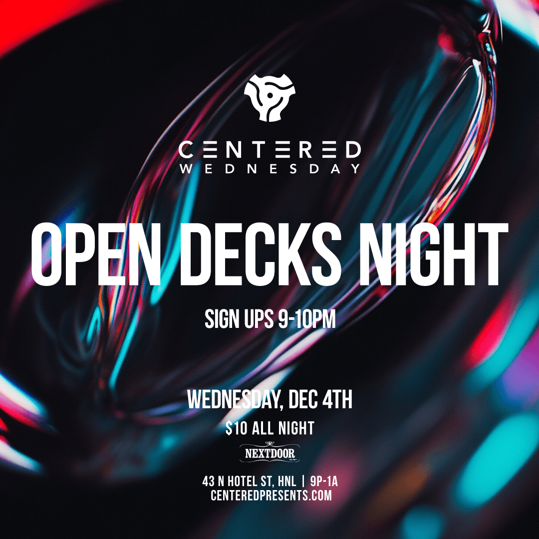 NextDoor 43 North Hotel St., Honolulu, HI, United StatesWednesday, Dec 4th CENTERED WEDNESDAYS OPEN DECKS NIGHT Bring your USB and Headphones and join us for our first ever OPEN DECKS night at Centered Wednesdays. 𝙂𝙐𝙄𝘿𝙀𝙇𝙄𝙉𝙀𝙎: • 30 MINUTES EACH DJ • BYOH (Bring your own headphones) • That’s it! This is a safe space and judgement free zone! Never played in front ... Read moreCentered Wednesdays – Open Decks Night
