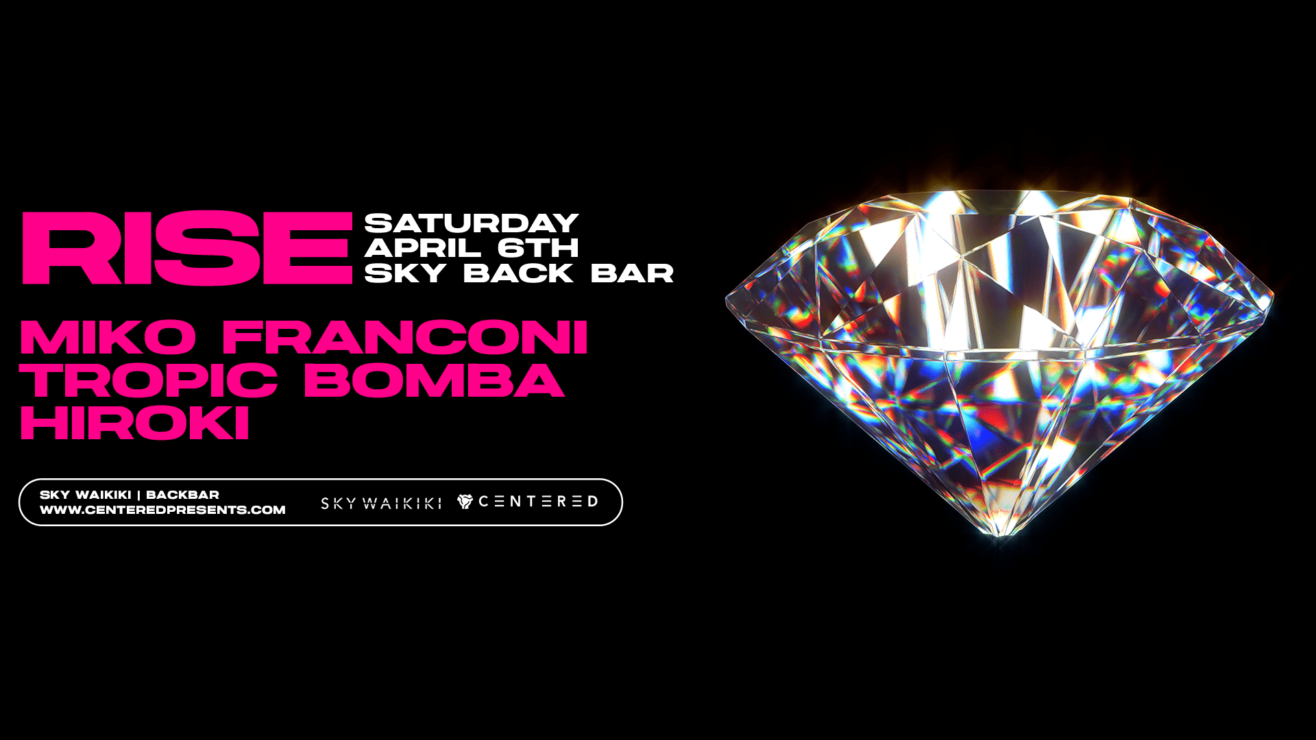 Saturday, April 6th 2024 Centered presents, RISE @ SKY WAIKIKI 10PM-11PM - HIROKI 11PM-12:30AM - MIKO FRANCONI 12:30AM-CLOSE - TROPIC BOMBA 10P-2A | SKY WAIKIKI BACKBAR CENTEREDPRESENTS.COM