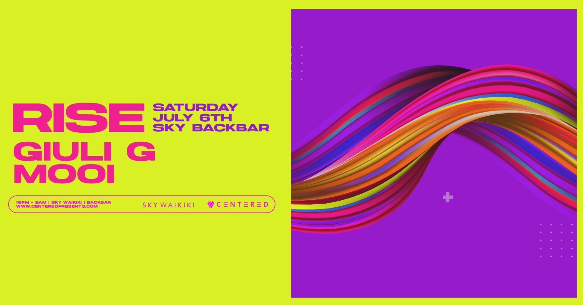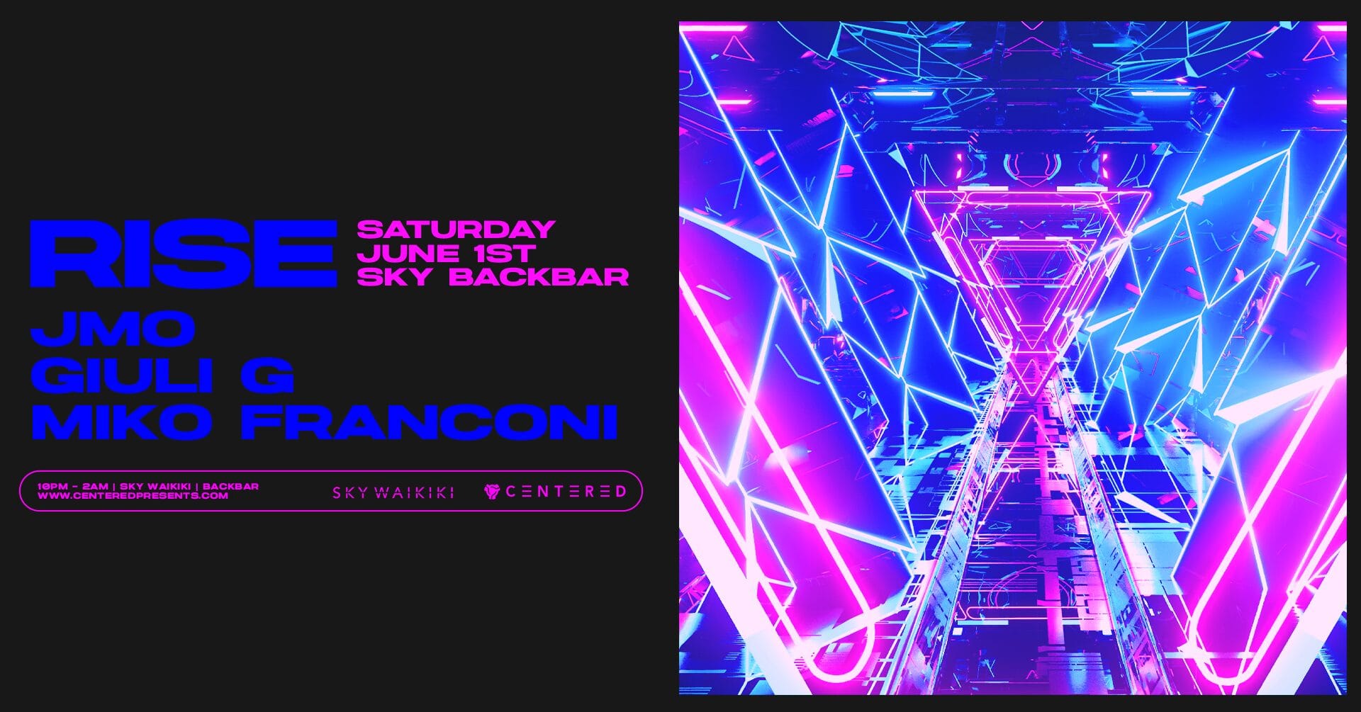Saturday, June 1st RISE @ SKY WAIKIKI LINEUP: JMO GIULI G MIKO FRANCONI (BDAY SET) Join us at Hawaii's premier rooftop nightclub in the heart of Waikiki. 10p-1a | sky backbar centeredpresents.com