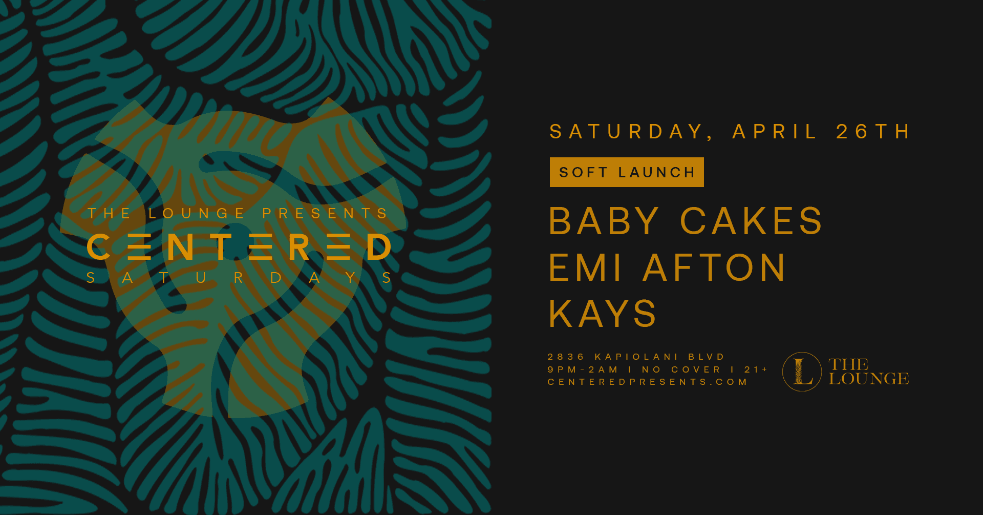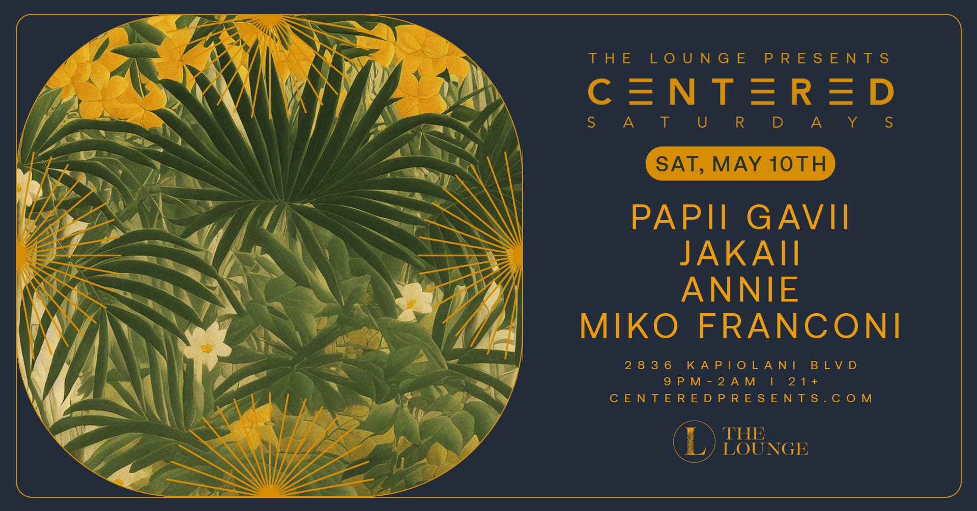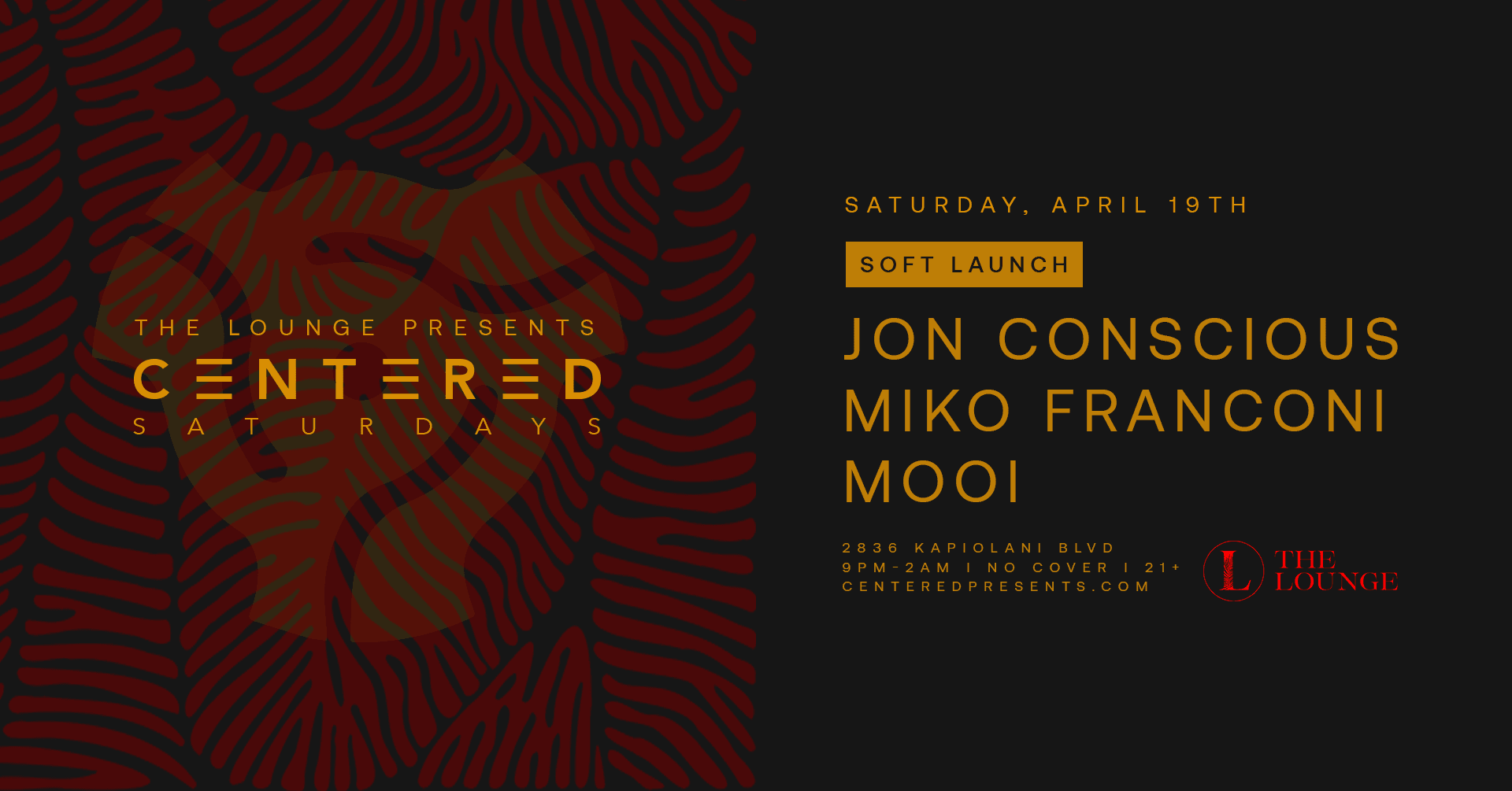The Lounge 2836 KAPIOLANI BLVD, Honolulu, United StatesSat, May 31st THE LOUNGE PRESENTS, CENTERED SATURDAYS MIKO FRANCONI SOLOMUNDO PARAKEET Centered Saturdays brings you a special night for our Gemini family. Show your ID with a Gemini birthday, and join us for NO COVER. 2836 KAPIOLANI BLVD 9PM-2AM | 21+ CENTEREDPRESENTS.COM