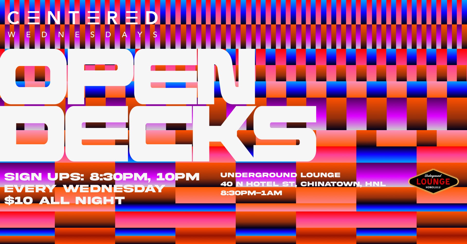 Underground Lounge 40 North Hotel St., Honolulu, United StatesWednesday, Aug 6th CENTERED WEDNESDAYS presents, OPEN DECKS Step behind the decks and into a judgement‑free zone at Centered Wednesday's Open Decks night! Whether you’re a seasoned selector or it’s your very first time, all skill levels are welcome. We’ve built an inclusive, safe space to experience what it’s like to play in a ... Read moreCentered Wednesdays – OPEN DECKS